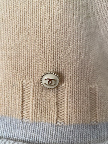 Ecru with gray trim. This sweater has a white enamel oval at the bottom in gold trim with gold "CC" in the center.