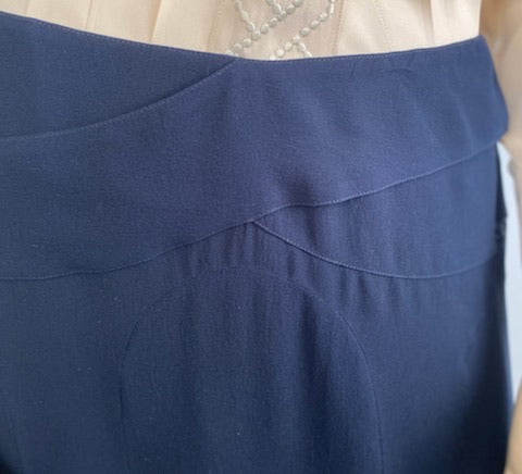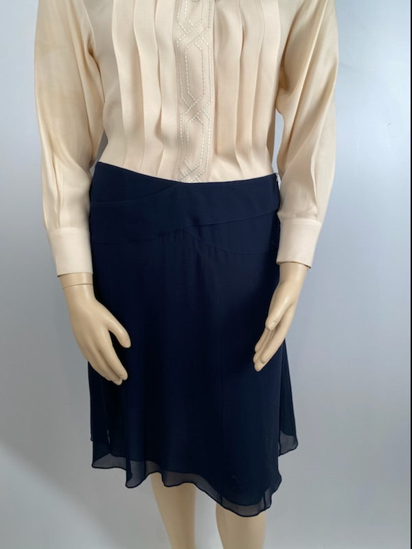 Chanel 06C, 2006 Cruise Resort Navy Blue silk chiffon skirt in dark navy blue. No waistband, with back zipper. There are 2 sections of sewn down layered curved fabric across the front and the waist for design. Metal a"CC" logo at hip.