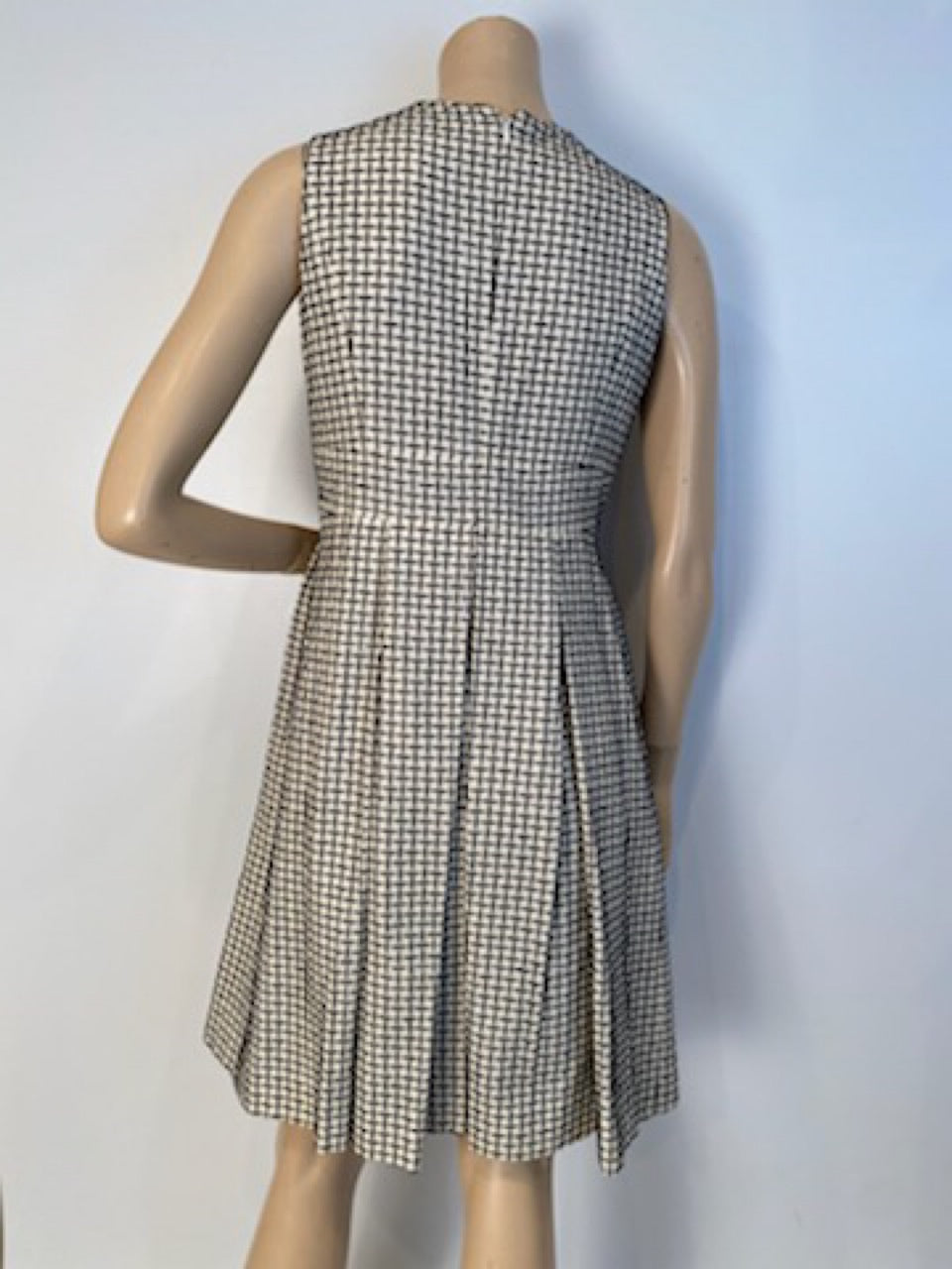 - Sleeveless dress with empire waist, above flattering wide pleats. Metal "CC" oval at the waist. It zips up the back with a hidden zipper.