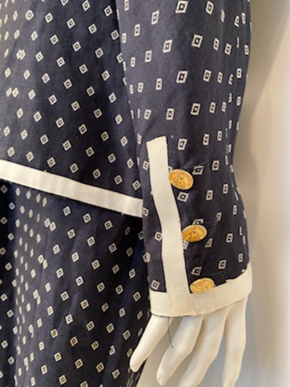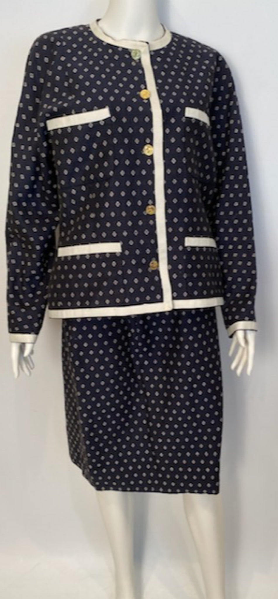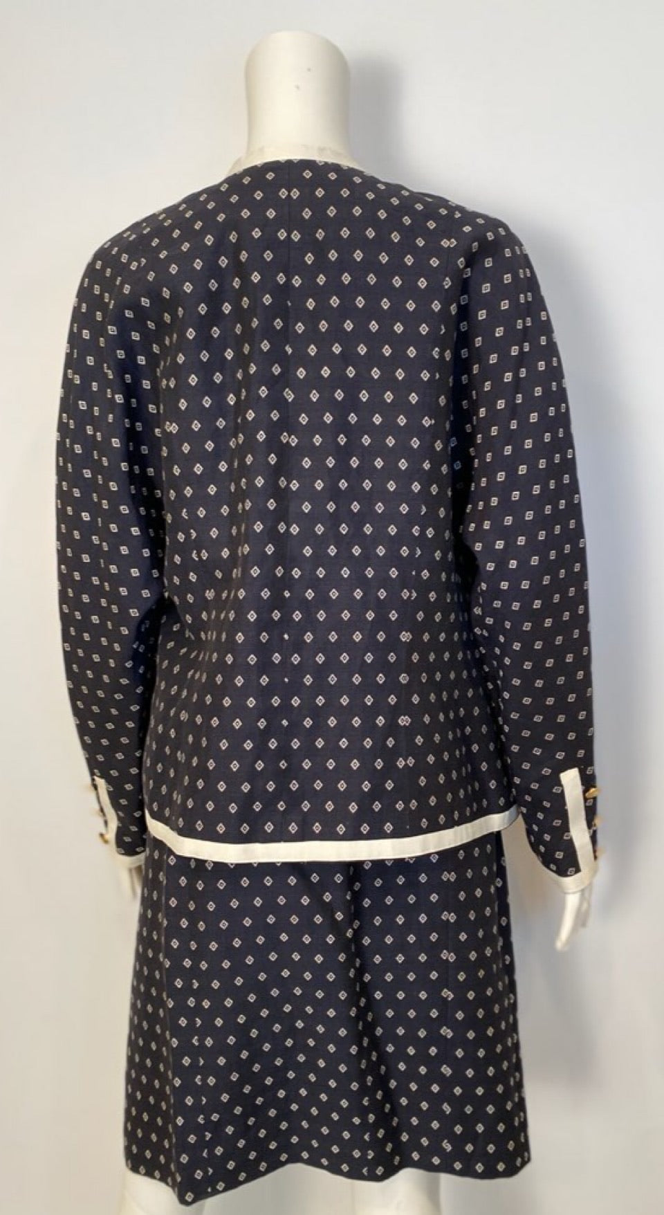 This suit is in very good Vintage condition. The white grosgrain trim has been replaced, and the only flaw I see is that there is a very small sliver of the Navy blue showing beside the trim which can be easily Corrected. However I have listed this suit at a greatly reduced price to compensate.