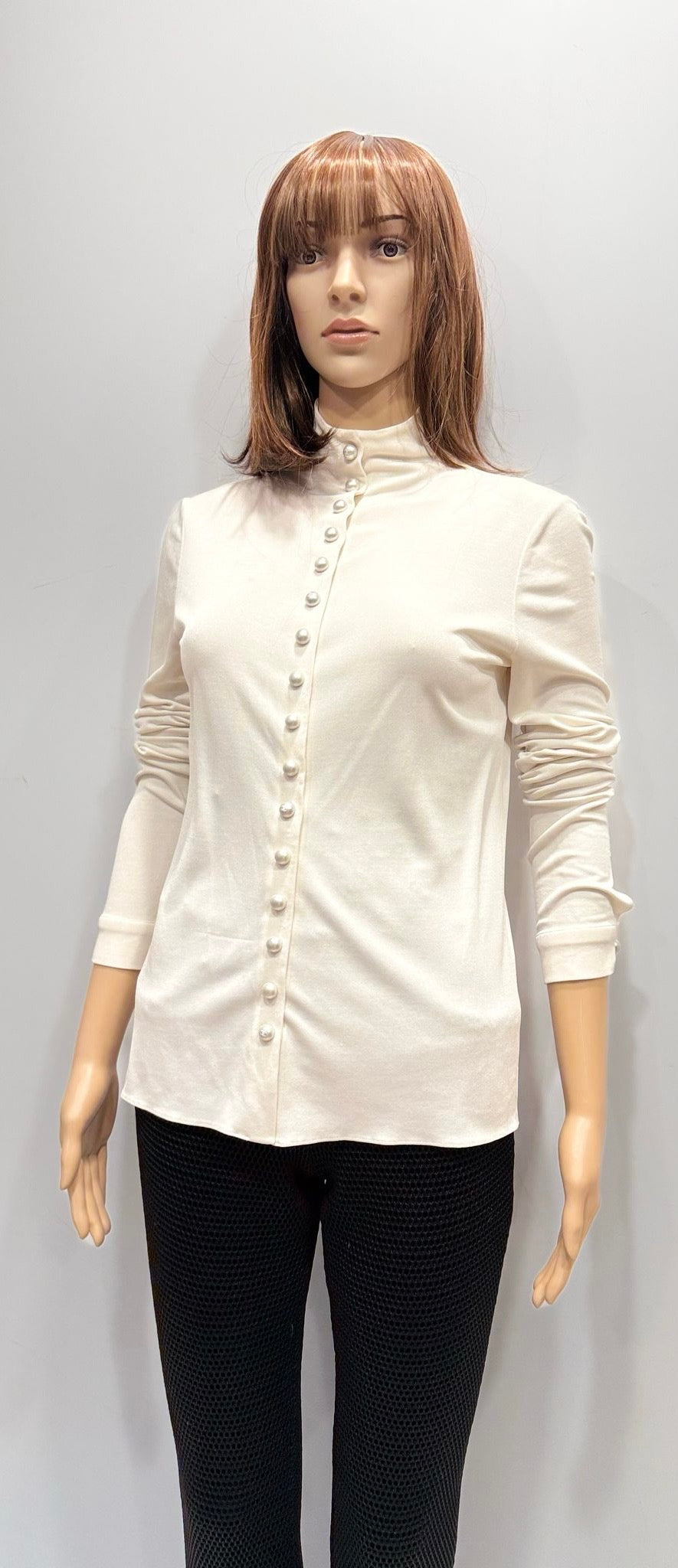 There are 16 EZ snap buttons (lookalike buttons but they snap instead of going through a button hole) The wrists each have a button as well. It is an Ivory color.