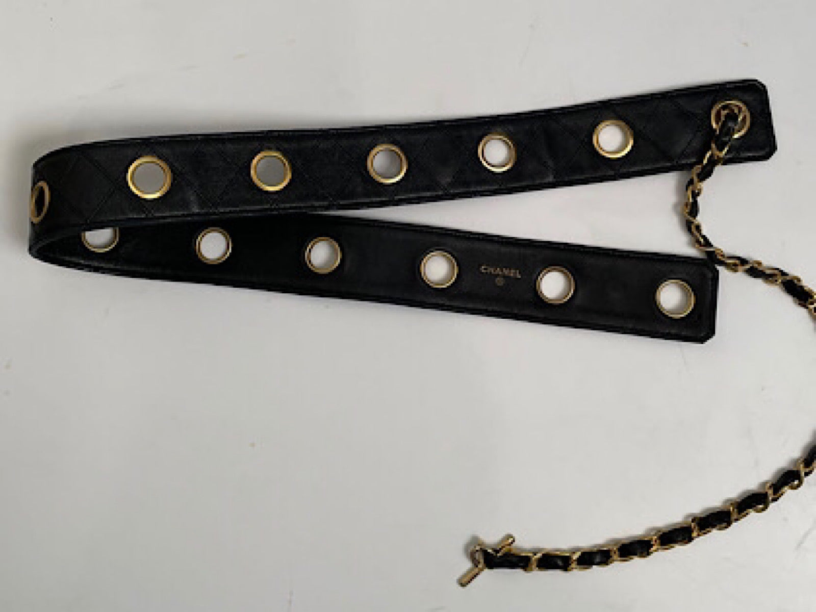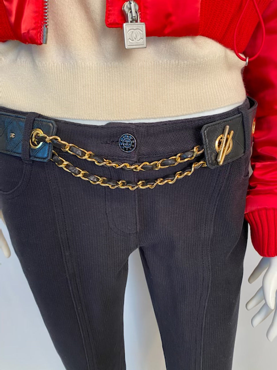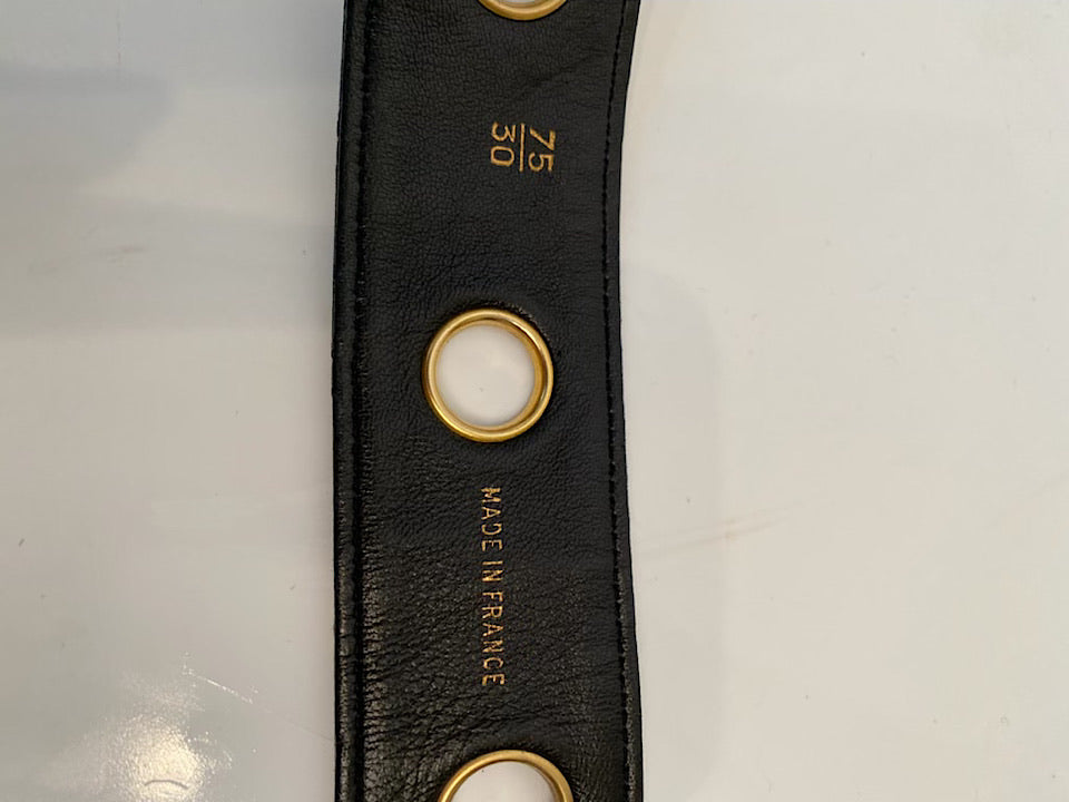 This 2" wide black leather Quilted Chanel belt is adjustable using the front chain. It slides into any of the 13 porthole buttons which ring the pants. The under side says "Made in France", 75/30 and has the word says "Chanel" over a small "CC" logo.