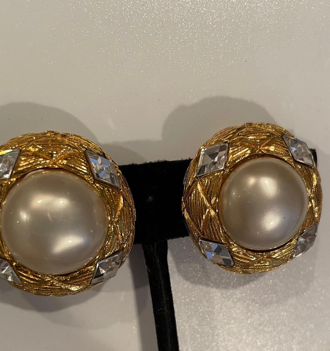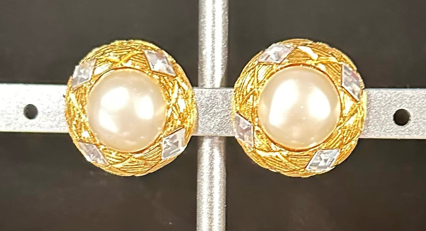 Vintage Chanel earrings in Gold with crystals, and large half pearls. Note: the information disc is round, indicating an older earring.