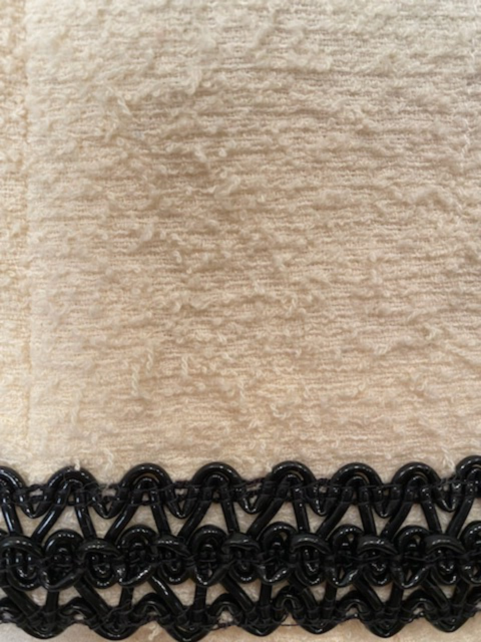 Ivory/cream/ecru jacket in textured wool, lined with "CC" silk. Chanel chain around the bottom to be sure it hangs evenly. There are 6 buttons with raised gold "CC"s, 3 on each sleeve. Designed to hang open, no front closure. The trim is a plastic nylon in Black, wildly popular, very hard to find today.