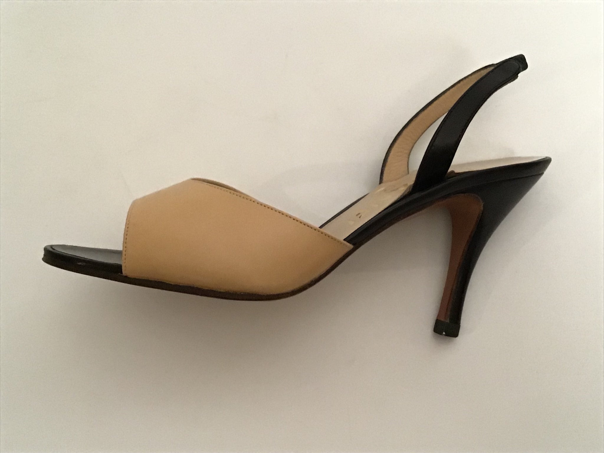 Classic Chanel bicolor slingback Heels. They are black and tan leather with peep-toe.