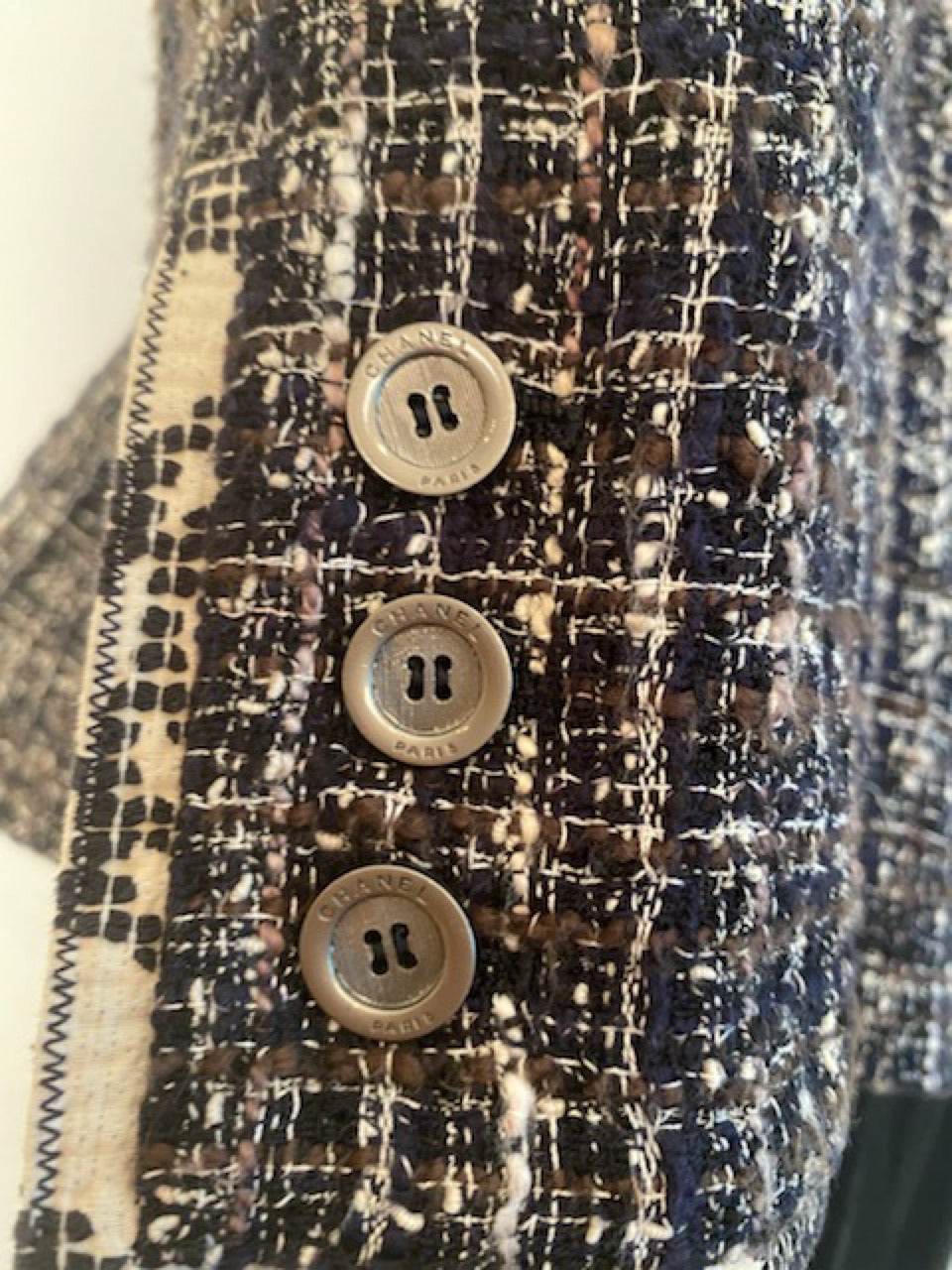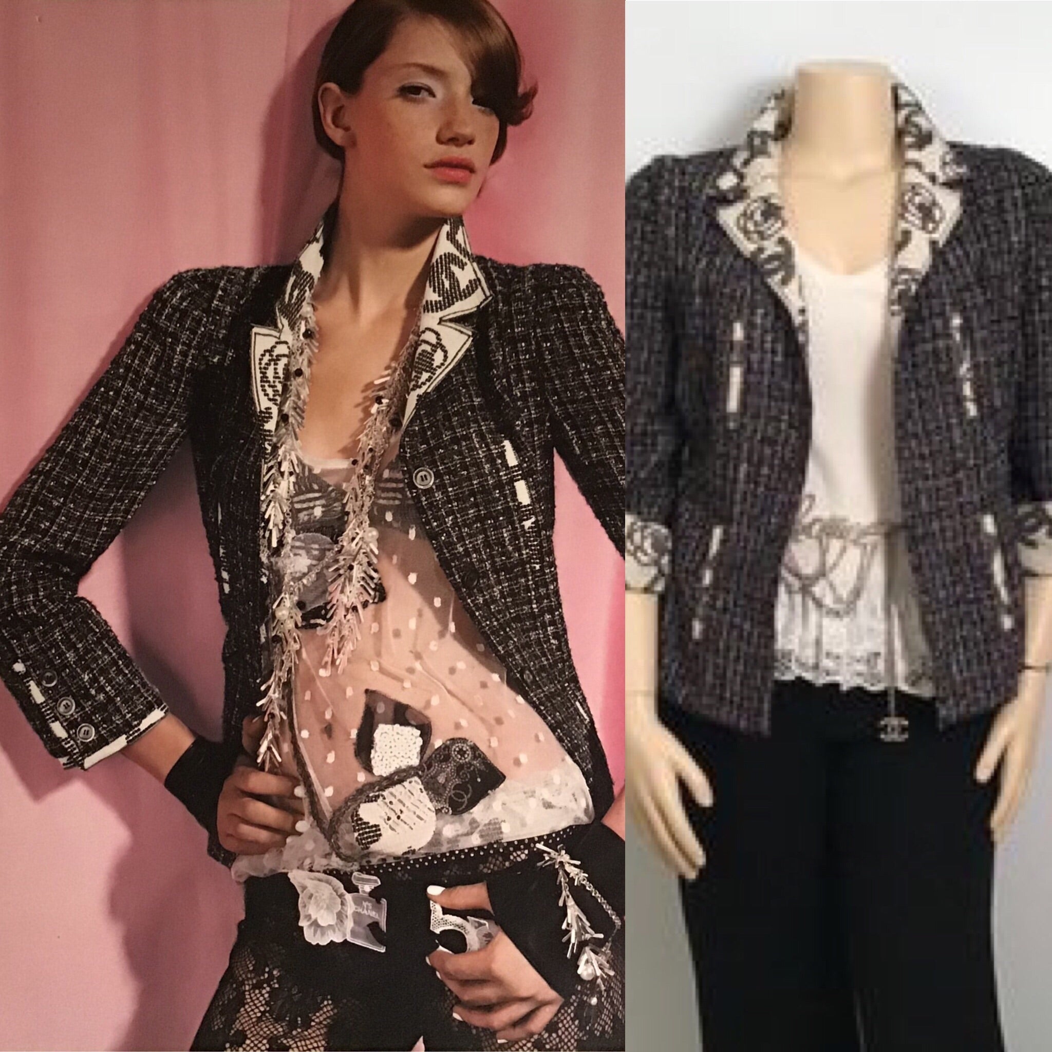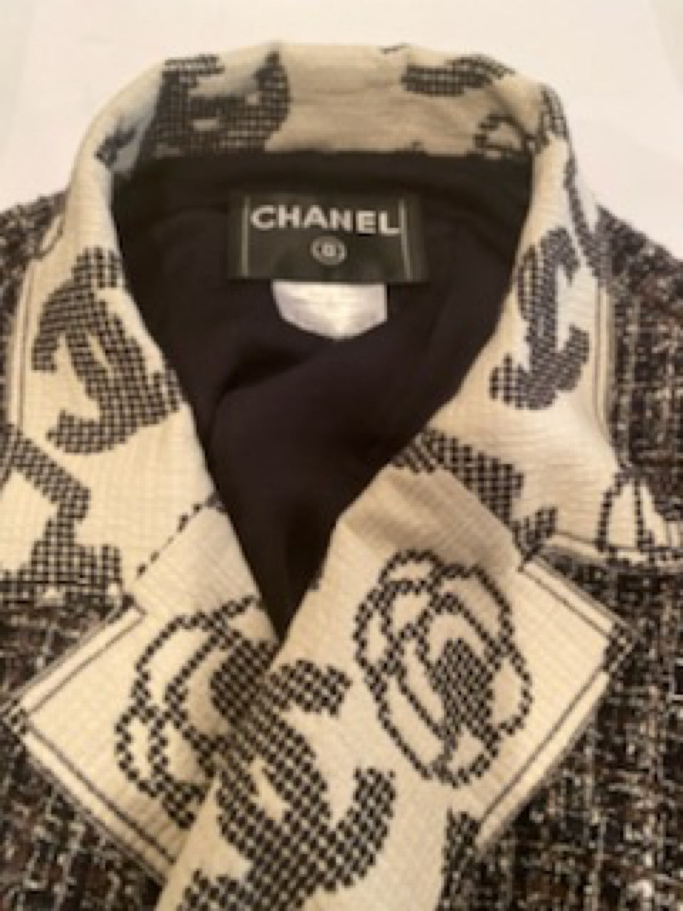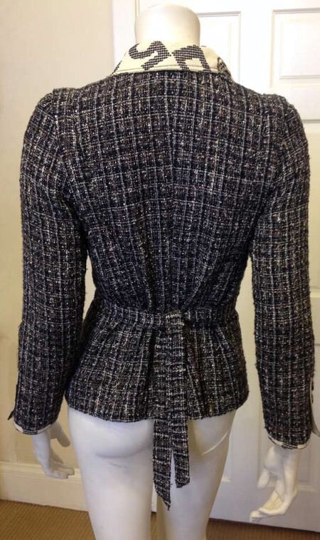 This cotton tweed Chanel jacket is from Chanel's 06P, 2006 Spring collection. It is shown in the Chanel catalog, with a very free an easy fun look. It is tweed, black, brown, white. There are 9 Chanel buttons, metal with "Chanel Paris” 3 for closure, and 3 on each sleeve. Fully lined, some of the lining is ivory, with huge Chanel icons, on the collar, cuffs, and lapels. Logos are approximately 3" tall-perfume bottle, "CC" logo, number "5", Camellia. On each side there is a 1" by 15" belt/tie for a more fitted look. Tie it in the back, or front. I have it shown with a Chanel white ribbed top, and a Chanel chain belt which spells the word "Chanel" in cursive. ( this piece doubles ar a necklace and is also available for sale on the website).