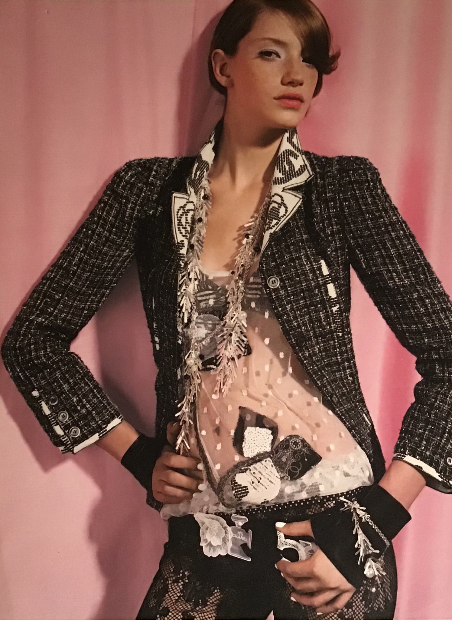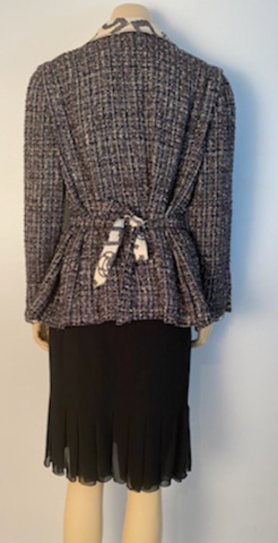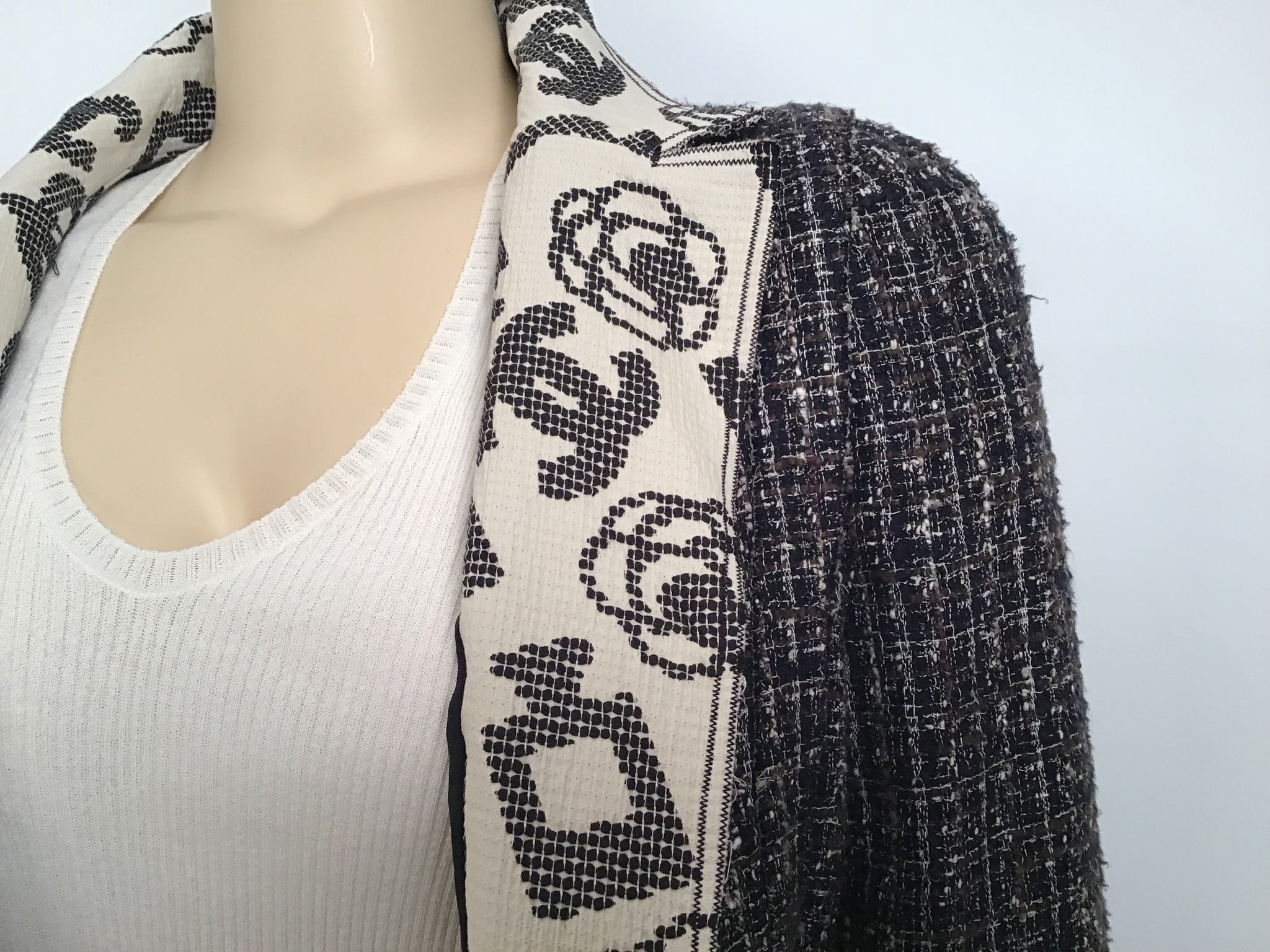 This cotton tweed Chanel jacket is from Chanel's 06P, 2006 Spring collection. It is shown in the Chanel catalog, with a very free an easy fun look. It is tweed, black, brown, white. There are 9 Chanel buttons, metal with "Chanel Paris” 3 for closure, and 3 on each sleeve. Fully lined, some of the lining is ivory, with huge Chanel icons, on the collar, cuffs, and lapels. Logos are approximately 3" tall-perfume bottle, "CC" logo, number "5", Camellia. On each side there is a 1" by 15" belt/tie for a more fitted look. Tie it in the back, or front. I have it shown with a Chanel white ribbed top, and a Chanel chain belt which spells the word "Chanel" in cursive. ( this piece doubles ar a necklace and is also available for sale on the website).