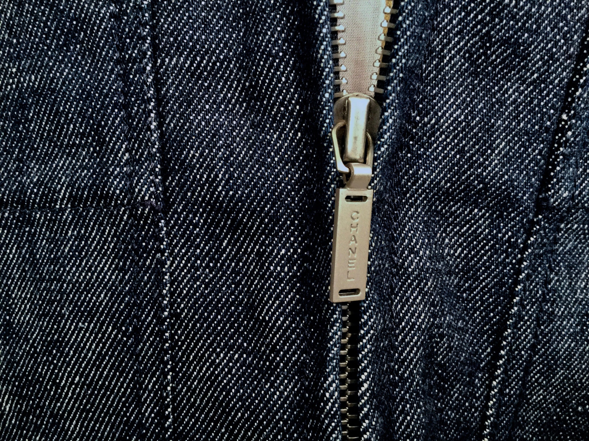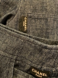 Both pieces zip up, and zipper pulls that have "Chanel" on them. The jacket has a "Chanel Paris” tag on one pocket. The skirt has a fly front, 2 gray metal "CC" buttons at the waist, and a "Chanel Paris” tag at the waist. The skirt has 10" slits, front and back, at the hem, so it's easy to walk in the long skirt. There are 2 typical curved pockets on the front, with topstitching. The jacket has 4 patch pockets on the front. The price is for the skirt and jacket - Shown with top and boots, sold separately.