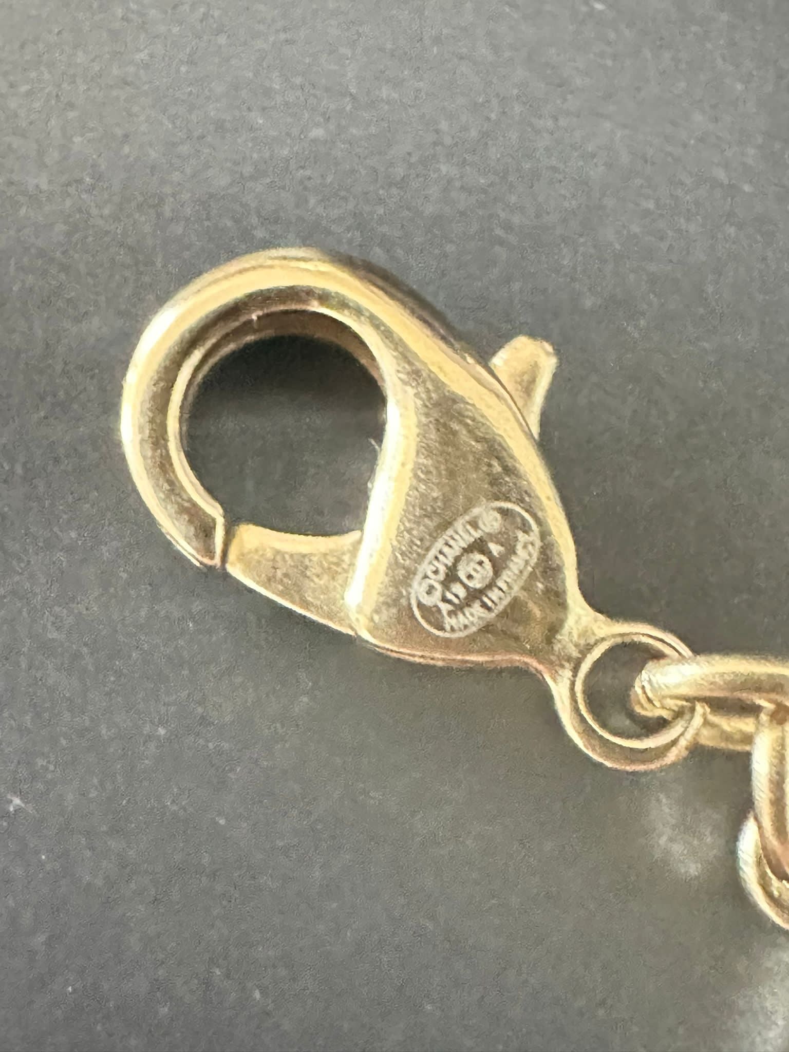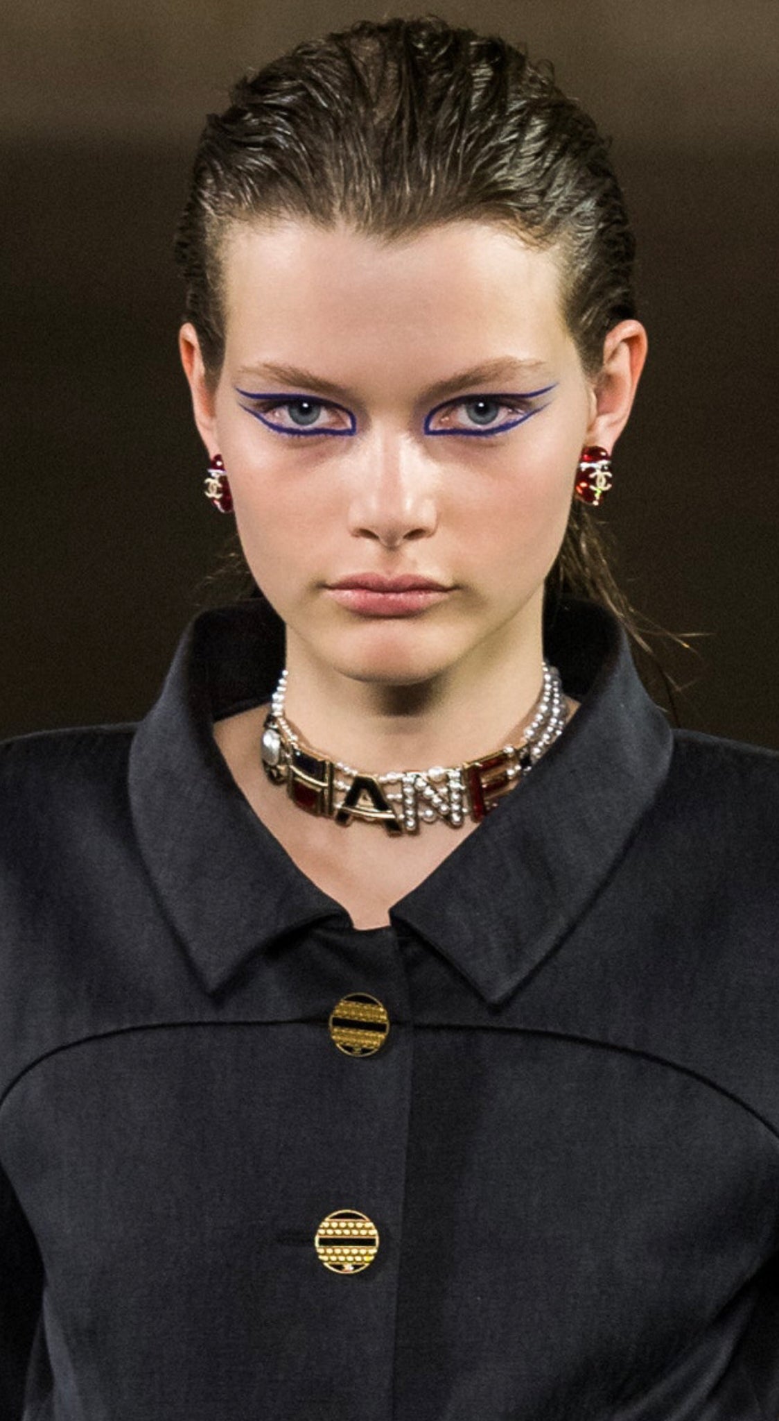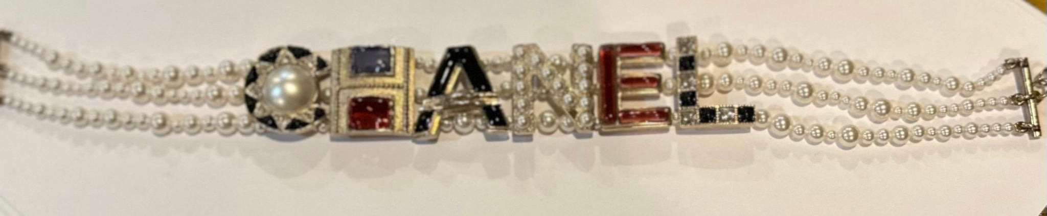 Features 3 strands of pearls, 11 1/2" long, with 1" x 1 3/4" letters attached to the front which spell "CHANEL" - each letter is embellished-poured glass, pearls, enamel, and crystals. The height is 1". The pearls fasten with a lobster clasp which attached to a link in a small chain in the back allowing you to increase the length by 2". Identification oval is etched on the clasp. A small CC logo is attached to the end of each chain.