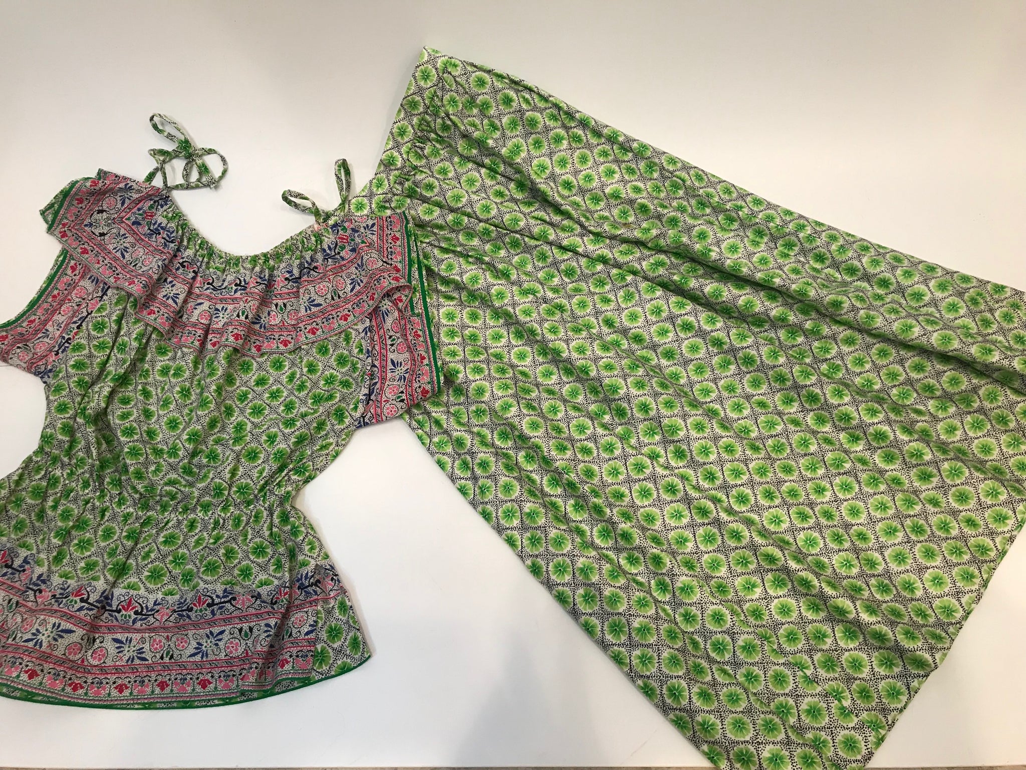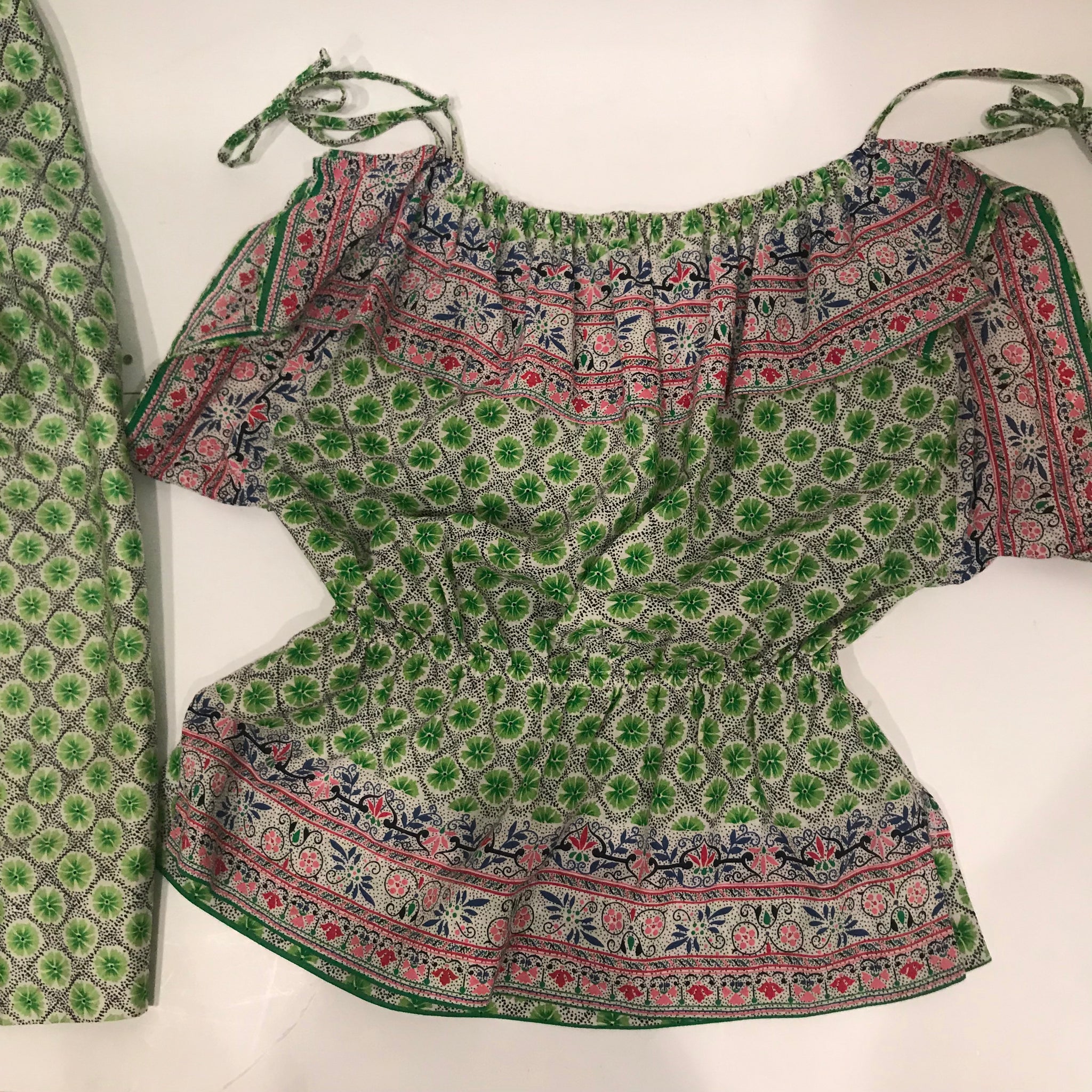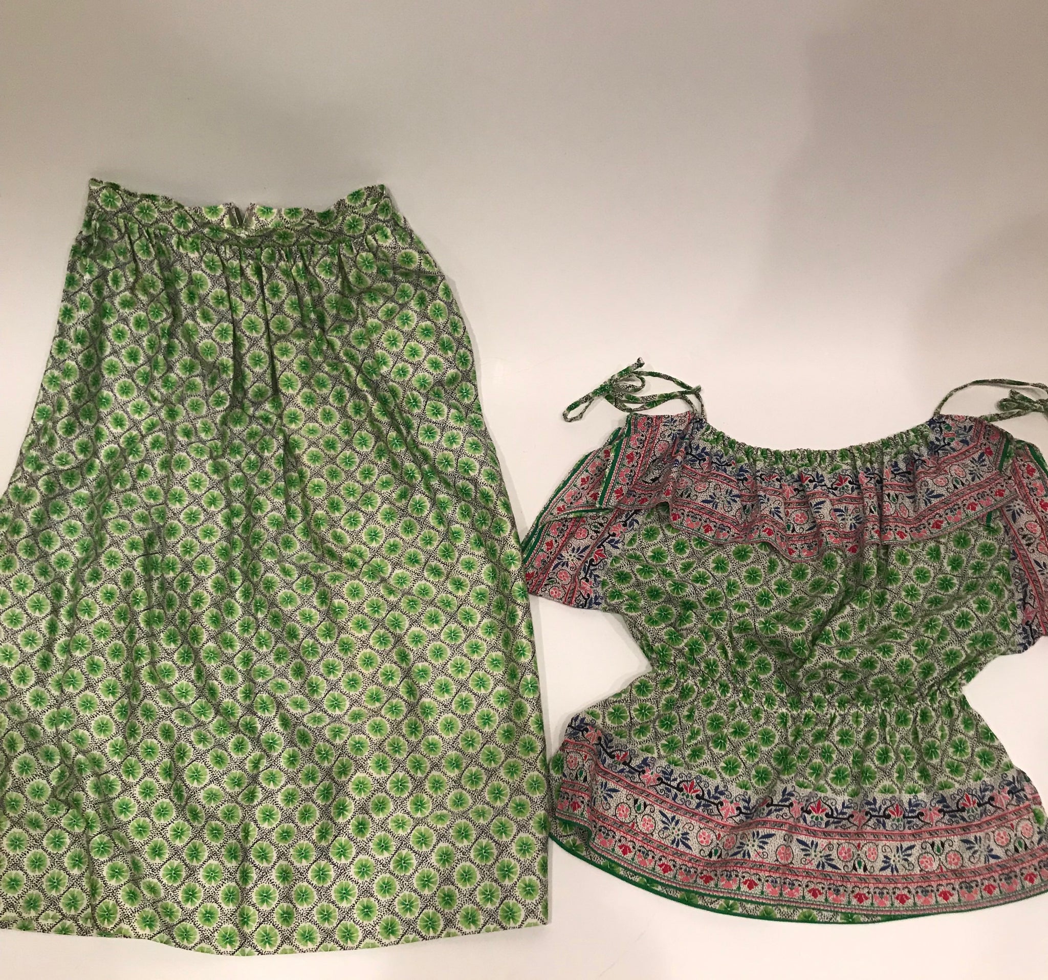 Mid length high waist skirt with back zipper. Matching top, ties at shoulders. Flattering green and pink pattern print.